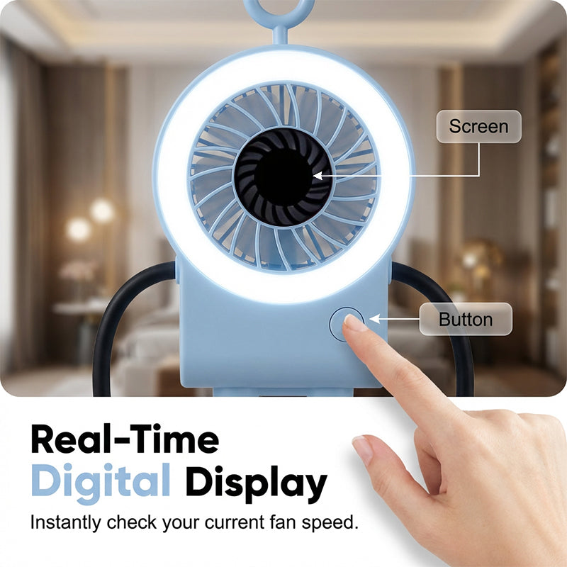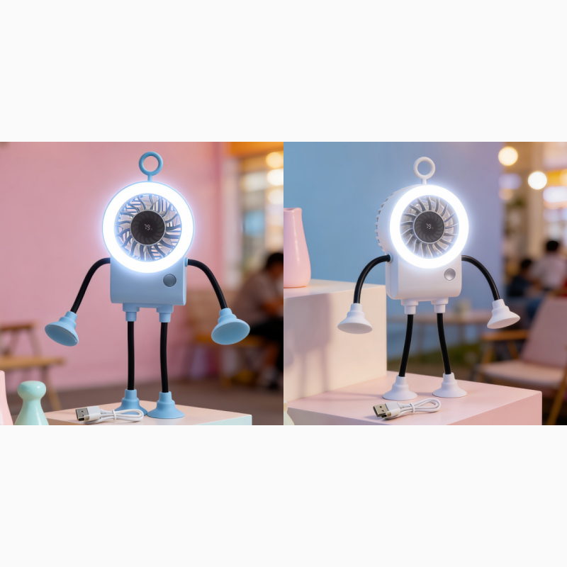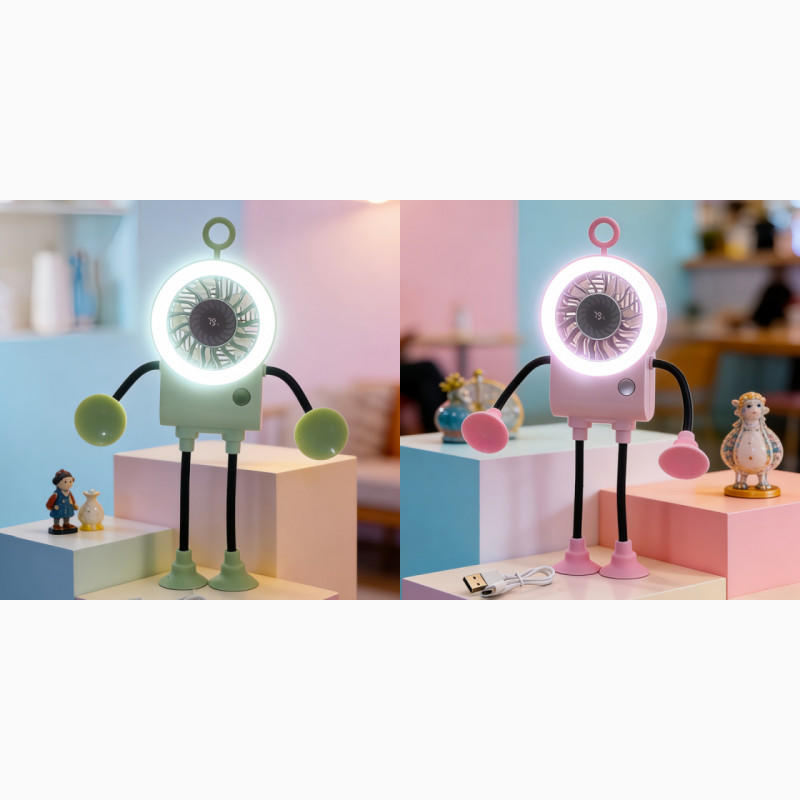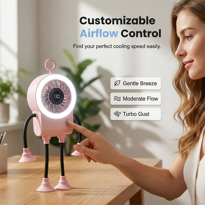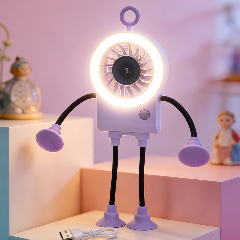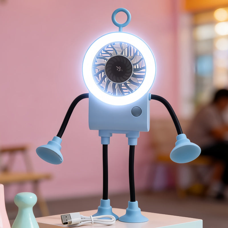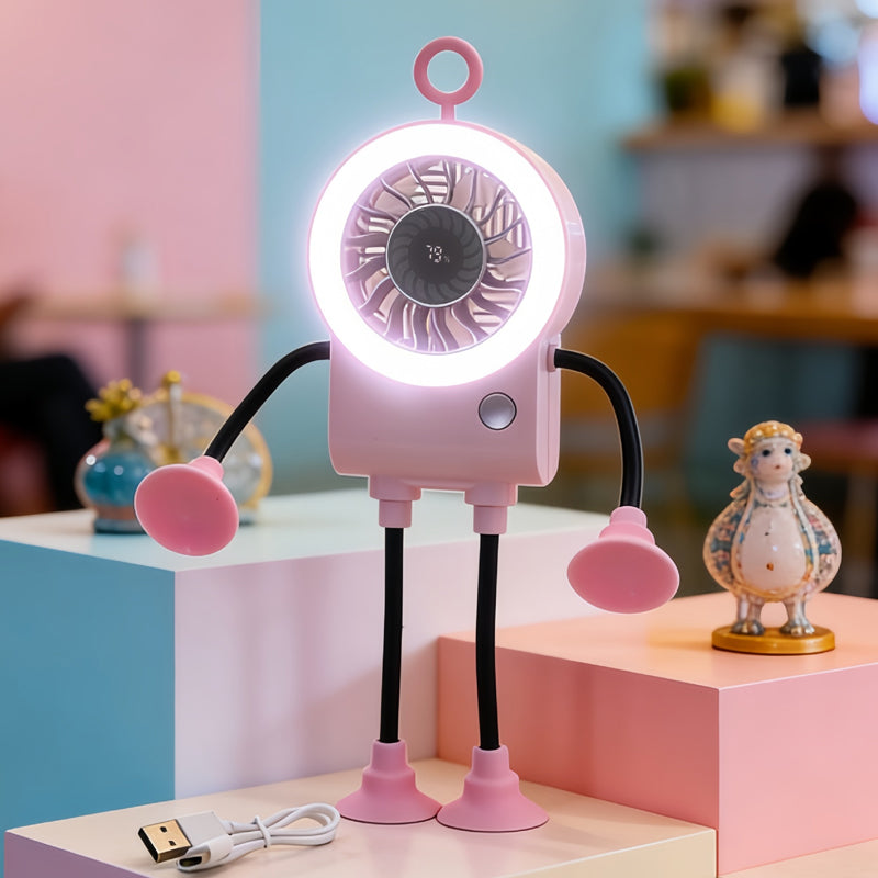 Meet your new desktop companion. This adorable robot fan features flexible limbs, an LED ring light, and a smart digital display for ultimate cooling comfort.